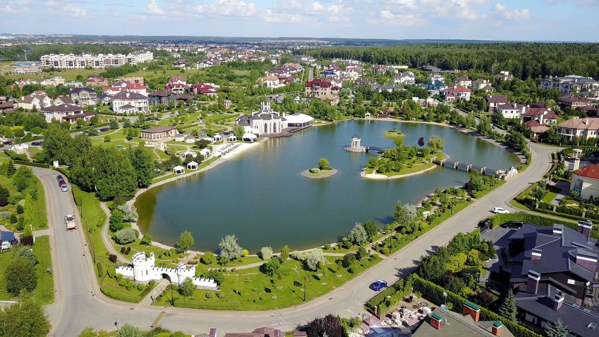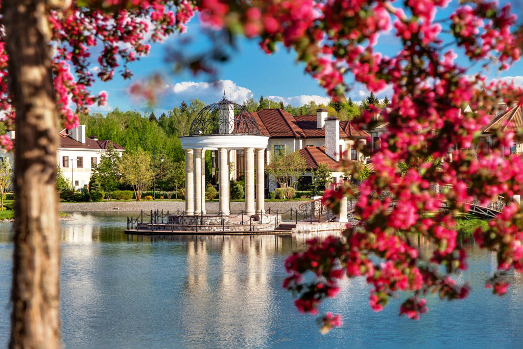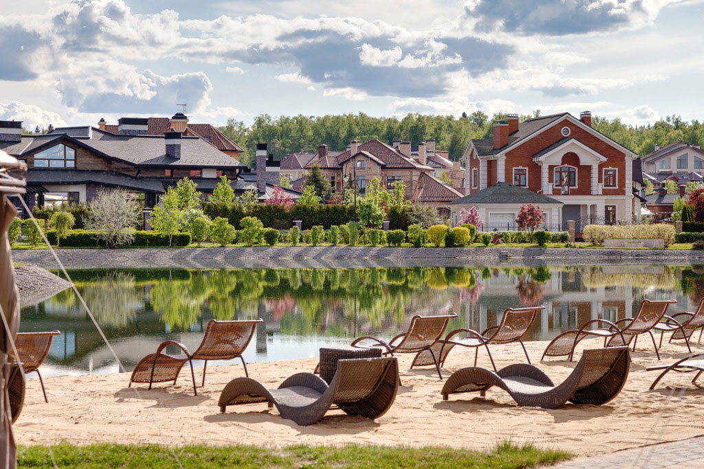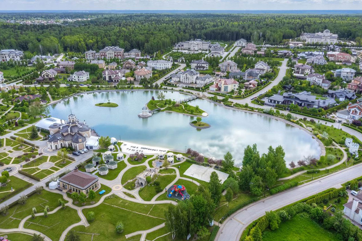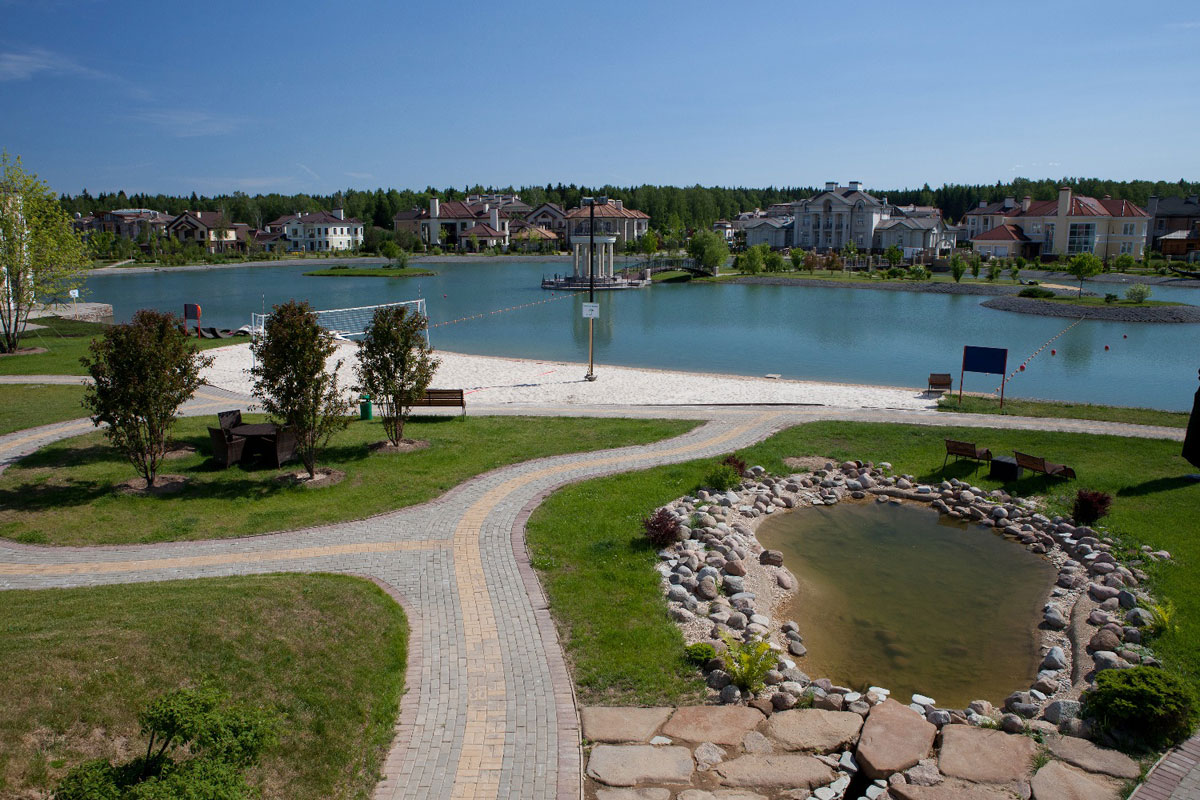 Инфраструктура внутренняя: общественная парковая территория площадью 4 гектара с живописным озером, элегантный ресторан на его берегу, теннисный корт, волейбольная площадка и пляж, лесная прогулочная зона, детский клуб, салон красоты, химчистка, минимаркет. Все коммуникации центральные. 2 КПП со строгой пропускной системой. Круглосуточное патрулирование и своя служба эксплуатации.