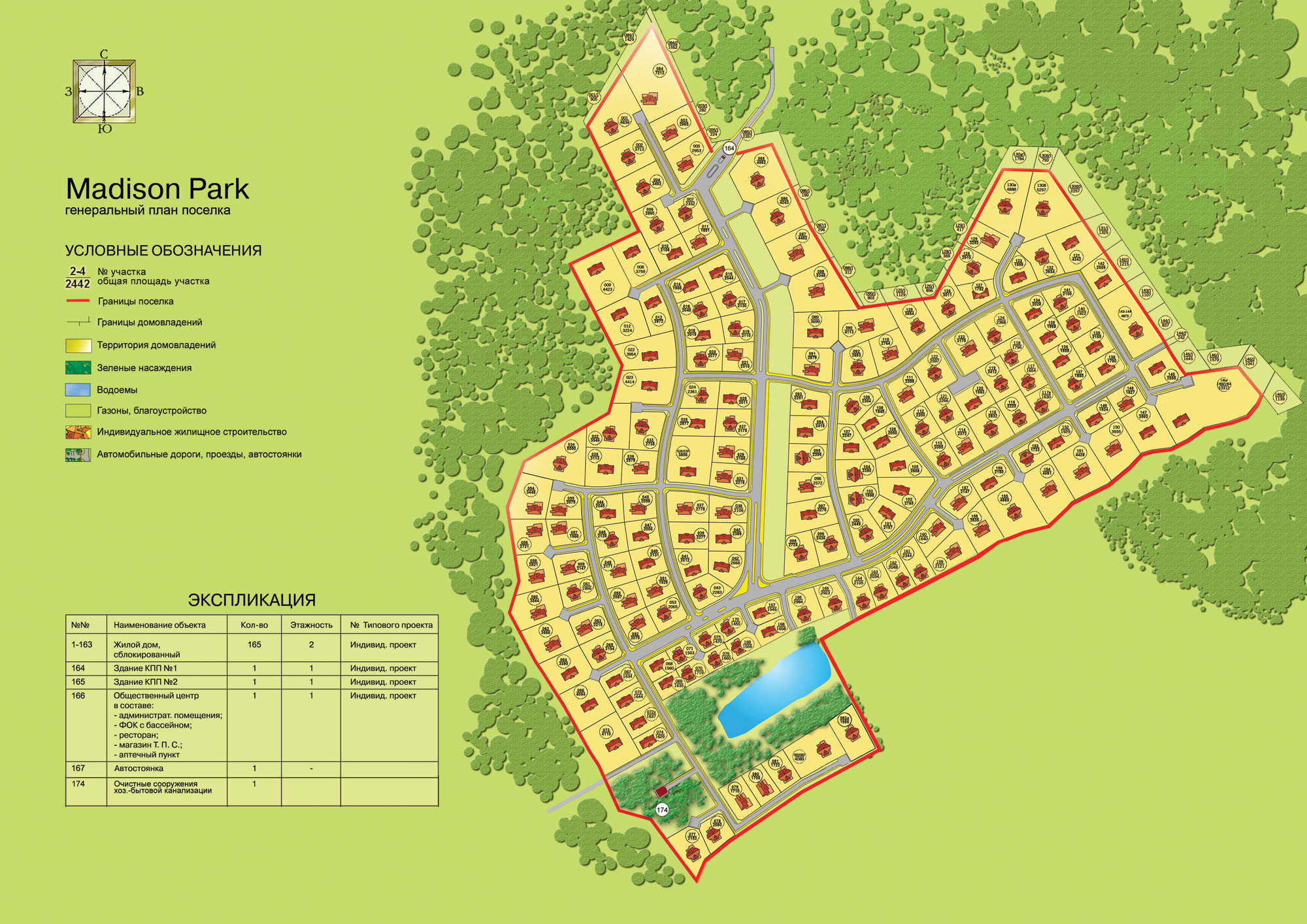 Мэдисон Парк - это элитный коттеджный поселок в окружении векового леса. Расположен на 25 км Новорижского шоссе. Территория этого камерного поселка площадью 52 гектара разбита на 163 участка площадью от 15 до 150 соток. Отличительной особенностью комплекса являются большие рекреационные зоны. Так жители некоторых домовладений смогут выйти с участка непосредственно в лес, к озеру или ландшафтному парку. Через поселок протянулся широкий бульвар с пешеходными дорожками вымощенными брусчаткой.